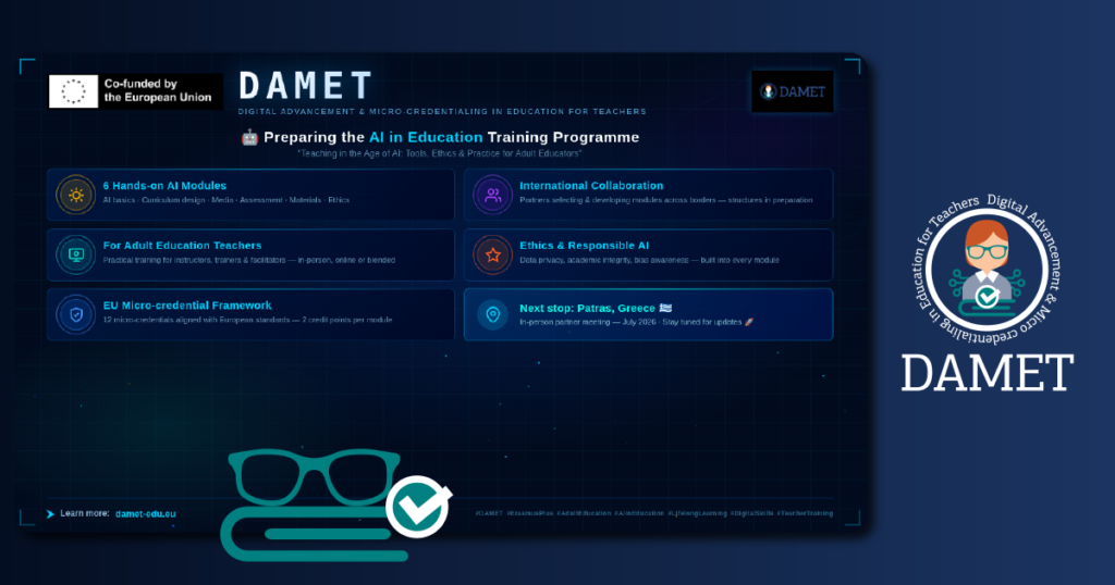 The DAMET project officially launches with the aim of supporting adult educators across Europe to strengthen their digital competences through artificial intelligence and microcredentials. Funded by the Erasmus+ Programme, DAMET responds to a growing need in adult education. Educators are increasingly expected to use digital and AI-based tools, often without clear training pathways or recognised […]